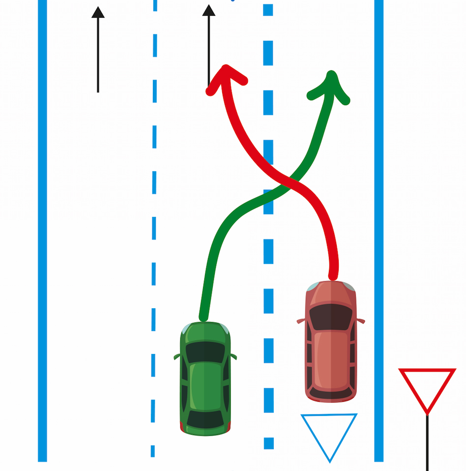 ¿Tenemos esta idea también cuando estamos en una intersección que no está señalizada?, espero que no, y apliquemos el artículo 57 del Reglamento General de Circulación, que determina la prioridad de paso en intersecciones sin señalizar. Pues aquí la norma a aplicar es lo recogido en el artículo 30 de la Ley de Seguridad Vial. «Cambios de vía, de calzada y de carril». «2. Toda maniobra de desplazamiento lateral que implique cambio de carril debe llevarse a efecto respetando la preferencia del que circule por el carril que se pretende ocupar. Que así mismo queda recogido en el artículo 74.2 del Reglamento General de Circulación». Es decir, cada vehículo, uno con la señalización (rojo) y otro con la norma (verde) deben conseguir que al realizar su desplazamiento lateral y cambiar de carril no fuercen al otro vehículo a modificar su trayectoria o velocidad, bruscamente. Ahora bien, ¿cómo es la manera más segura de salir y entrar en uno de estos carriles trenzados? Aquí la norma no dice nada de qué vehículo debe situarse delante del otro ni nada parecido, pero pensémoslo detenidamente: Si el vehículo verde, que sale de la vía tratara de ponerse delante del rojo…¿no creen que sería una torpeza? El vehículo rojo tiende a acelerar porque se incorpora a una vía desde su ramal de acceso y el vehículo verde tiende a disminuir su velocidad porque sale. ¿No creen que es más inteligente que el vehículo que abandone la vía intente situarse detrás del que se incorpora (rojo)? Así el que entra en la vía acelera y se aleja y el vehículo que sale (verde) frena y ninguno molesta ni genera peligro al otro.